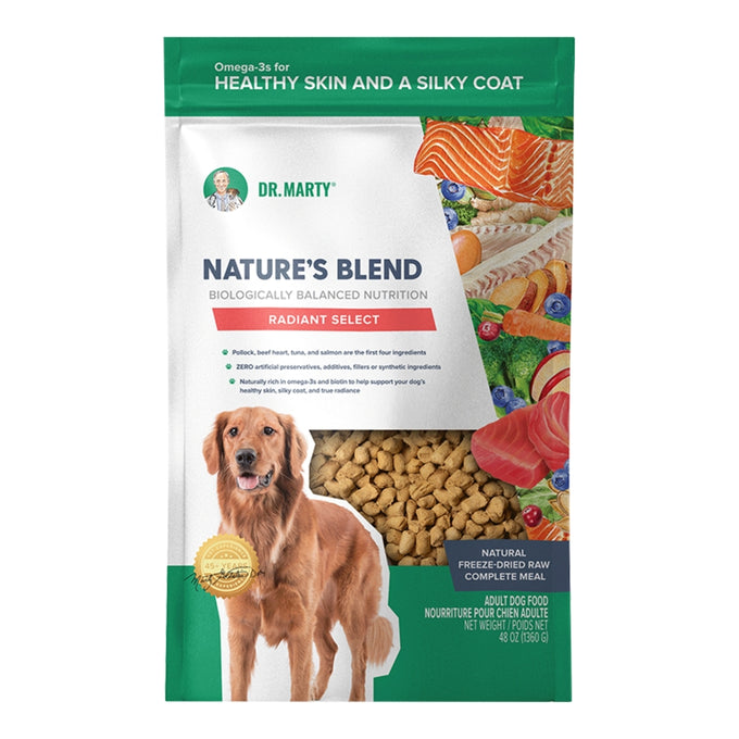 Dr. Marty Nature’s Blend – Radiant Select is a premium, freeze-dried raw dog food designed to give your dog nutritional support for a healthy skin and coat.