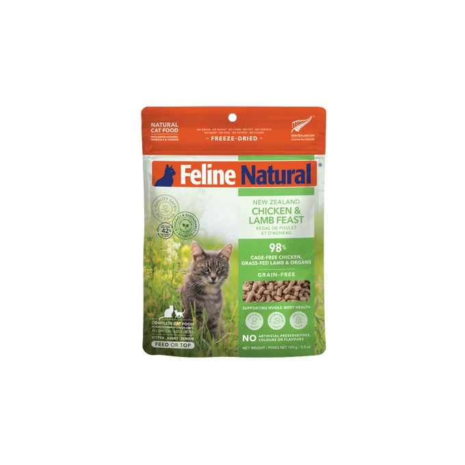 Our complete and balanced Freeze-Dried New Zealand Chicken & Lamb Feast contains 98% Cage-Free Chicken, Grass-Fed Lamb, and Organs with New Zealand Green Mussels, Kelp, Taurine, Flaxseed Flakes, Vitamins, and Minerals in support of your cat's whole-body health.