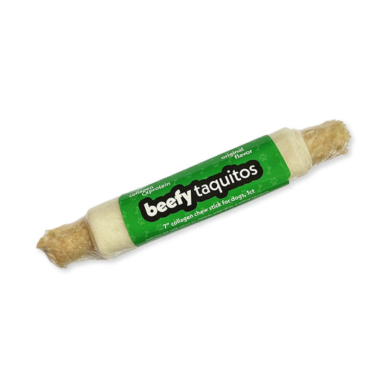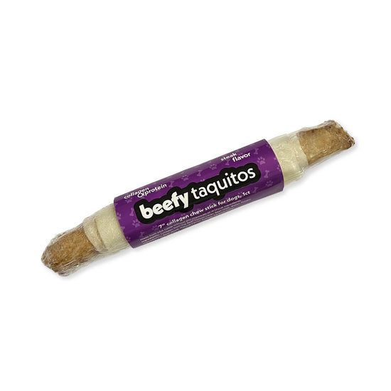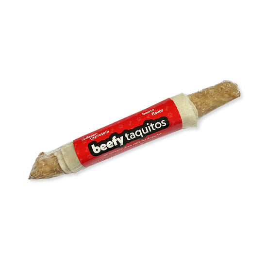 Beefy Taquitos are absolutely delicious and packed with collagen, a highly-digestible ingredient known to promote healthy skin, coat, joints, nails and teeth. They’re made from 100% traceable USA cattle and are wheat, sugar, preservative and GMO free. Beefy Taquitos are a two-in-one fun and healthy treat for every dog!