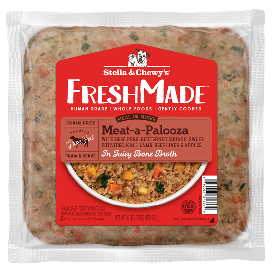 Beef, Pork, Butternut Squash, Sweet Potato, Kale, Beef Bone Broth, Lamb, Beef Liver, Apples, Ground Flaxseed, Tricalcium Phosphate, Thiamine Mononitrate, Vitamin E Supplement, Niacin Supplement, D-calcium Pantothenate, Riboflavin Supplement, Vitamin A Supplement, Vitamin B12 Supplement, Vitamin D3 Supplement, Pyridoxine Hydrochloride, Folic Acid, Zinc Proteinate, Iron Proteinate, Copper Proteinate, Manganese Proteinate, Sodium Selenite, Dried Kelp, Dried Chicory Root (source of Inulin), Choline Chloride, Salt, Taurine, Salmon Oil (Preserved with Mixed Tocopherols), Turmeric, Ginger