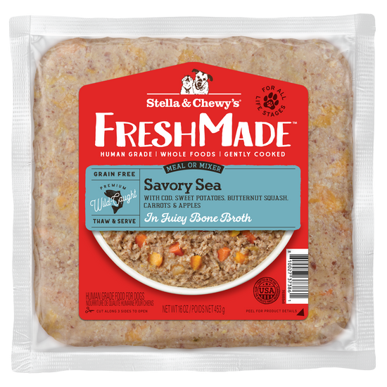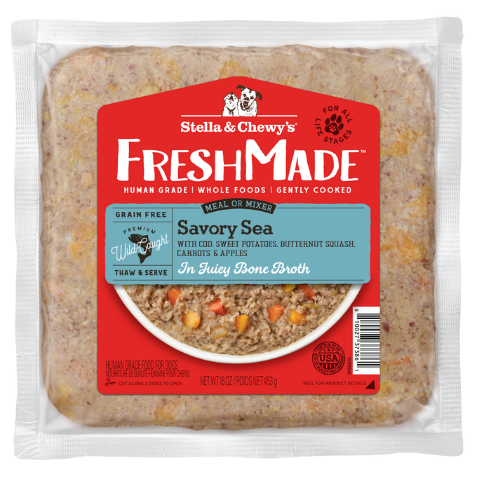 Cod, Sweet Potato, Butternut Squash, Carrots, Fish Bone Broth, Apples, Ground Flaxseed, Sunflower Oil (Preserved with Mixed Tocopherols), Salmon, Tricalcium Phosphate, Calcium Carbonate, Salt, Taurine, Dried Chicory Root (source of Inulin), Potassium Chloride, Thiamine Mononitrate, Vitamin E Supplement, Niacin Supplement, D-calcium Pantothenate, Riboflavin Supplement, Vitamin A Supplement, Vitamin B12 Supplement, Pyridoxine Hydrochloride, Folic Acid, Zinc Proteinate, Iron Proteinate, Copper Proteinate, Manganese Proteinate, Sodium Selenite, Dried Kelp, Choline Chloride, Salmon Oil (Preserved with Mixed Tocopherols), Turmeric, Ginger